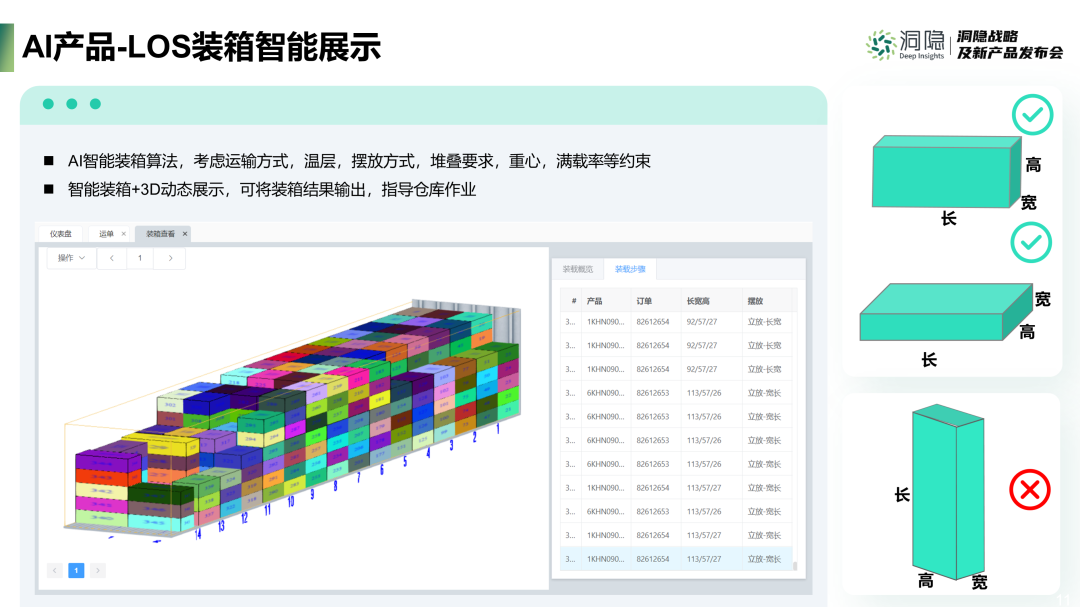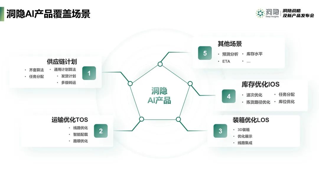 洞隱AI產品覆蓋計劃、運輸優化TOS、裝箱優化LOS、庫存優化IOS等供應鏈業務場景。