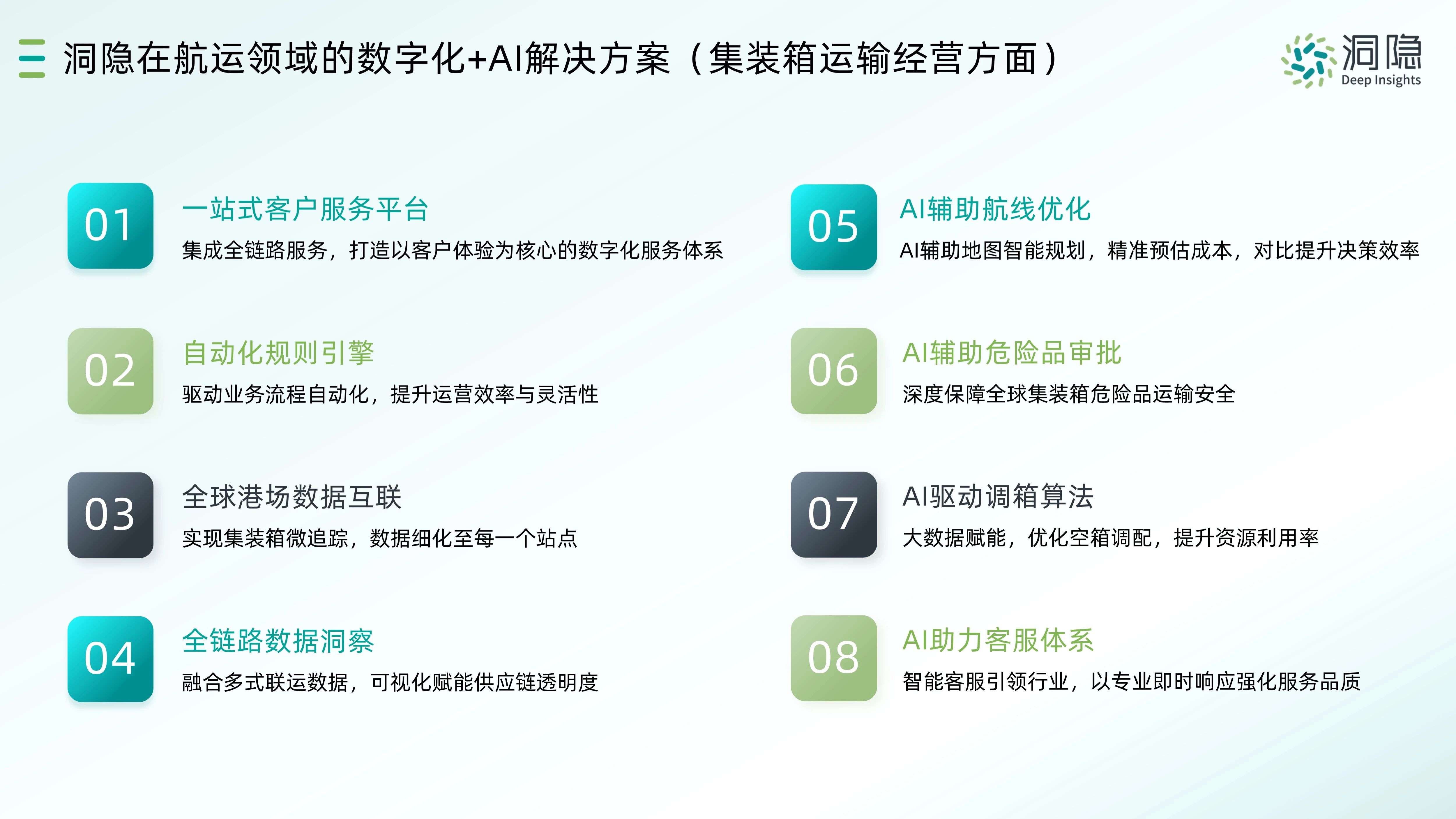 從數據貫通到效率提升,從成本優化到風險管控,洞隱科技以“數字化+AI”為核心的解決方案,破解航運業數字化轉型痛點,為行業構建協同、高效、安全的發展新生態。