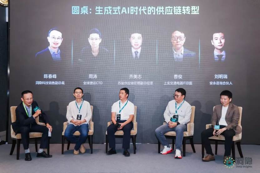 在最后的圓桌對話環節,洞隱科技銷售副總裁陳春峰攜全球捷運CTO周濤、蘇鹽供應鏈管理副總經理齊美志,以及分享嘉賓曹俊與劉明瑞,圍繞“生成式AI時代的供應鏈轉型”這一話題,展開探討了AI技術如何在供應鏈管理中發揮關鍵作用,提升數據價值。