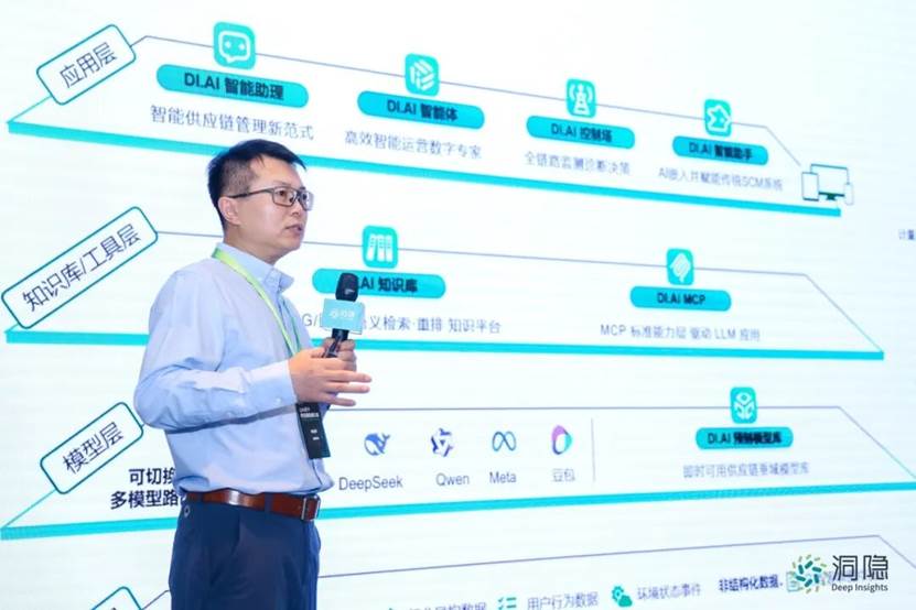 隨后,洞隱科技創始人兼CEO劉斌正式發布了洞隱DI.AI智能產品戰略,提出“讓每一條供應鏈數據都能被AI理解”。DI.AI產品體系涵蓋智能控制塔、智能助理、智能助手、智能體、知識庫、預置模型庫及MCP工具集。他強調,我們正進入供應鏈軟件的“AI智能時代”,其核心是從“數據連接”躍遷至“數據理解”,讓AI真正訪問、洞察并行動于每一條供應鏈數據,最終實現“AI增強-AI原生-AI生態”的全面賦能。