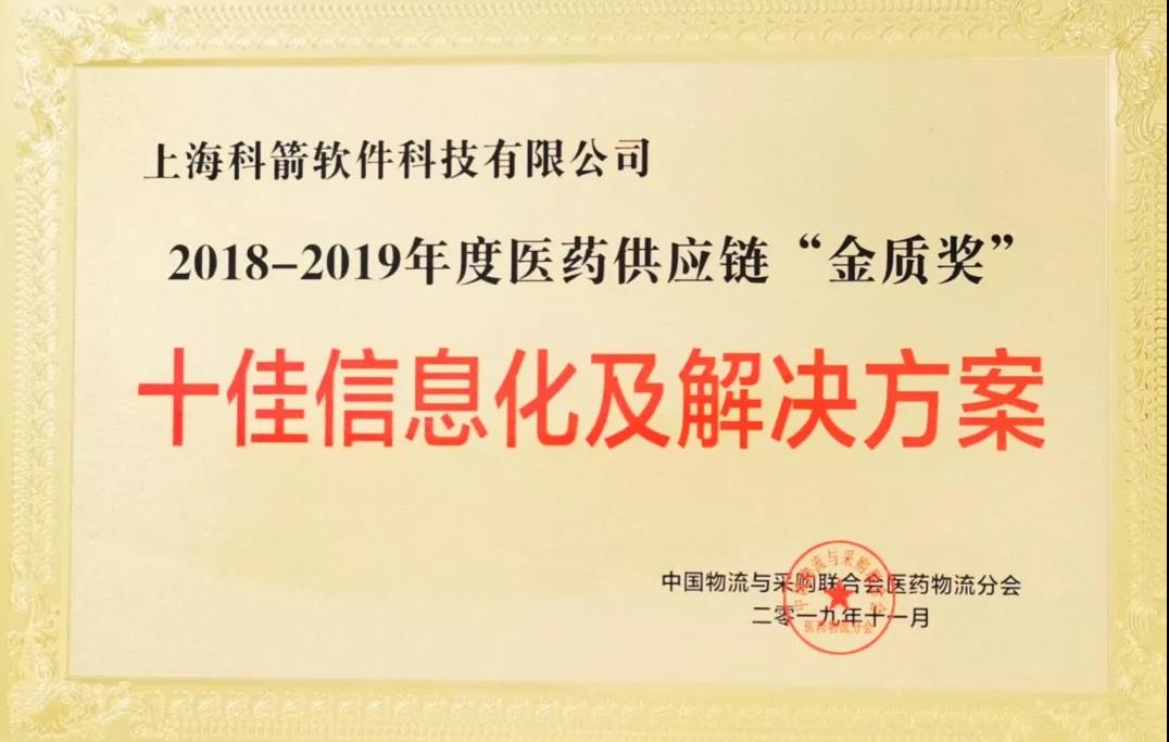 在這次盛會上,科箭軟件憑借多年深耕行業與供應鏈領域的經驗和實踐,創新不停、進步不止的敬業精神,基于供應鏈云平臺Power SCM Cloud的科箭醫藥行業供應鏈一體化解決方案,榮獲2018—2019(第三屆)醫藥供應鏈“金質獎”。