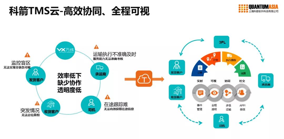 科箭TMS云能夠幫助貨主、物流公司及其合作伙伴(承運商及司機)通過PC或手機訪問同一個共享的云平臺,實現運輸工作協同化及流程360度可視化。