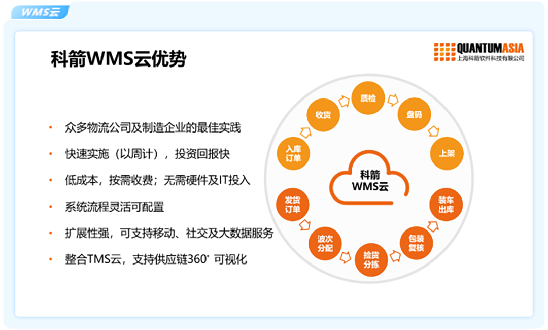 科箭在供應鏈領域擁有十多年的經驗,是國內最早轉型云端的供應鏈軟件公司。WMS云是基于行業沉淀設計的專業SaaS倉儲管理產品。針對制造、零售、物流及電商等行業,WMS云流程可配置,場景化設計,可快速上線,投資回報快。