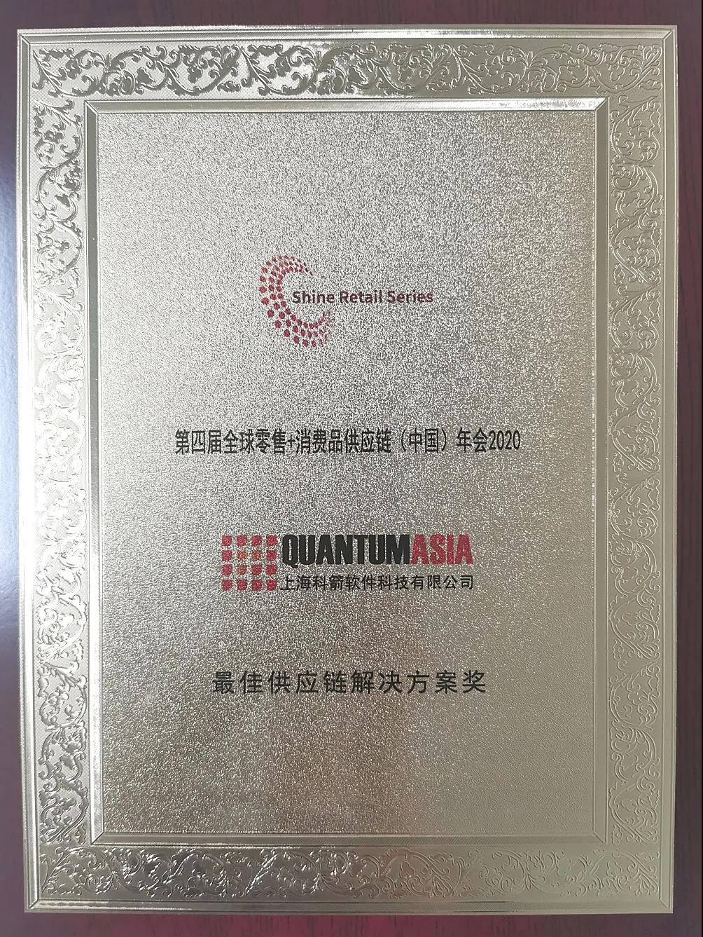 在第四屆全球零售+消費品 (中國) 年會暨年度金鏈獎頒獎盛典上,科箭軟件榮獲“最佳供應鏈解決方案獎”。
