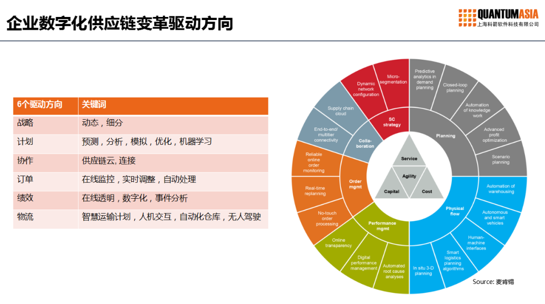 麥肯錫提出了企業(yè)數(shù)字化變革的六個(gè)驅(qū)動(dòng)方向:戰(zhàn)略、計(jì)劃、協(xié)作、訂單履約、績(jī)效、物流。供應(yīng)鏈本身就是圍繞這幾個(gè)方向展開(kāi)工作的,同時(shí)需要獲得數(shù)字化科技的支撐。