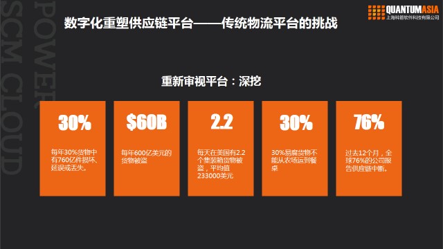 傳統物流運營效率低下,在轉型過程中面臨著巨大挑戰。據統計,每年有600億美元的貨物被盜,30%的貨物損毀,30%的易腐貨物不能從農場運到餐桌,76%的公司報告過供應鏈中斷。凱捷的調研報告指出,65%的企業已經開始了供應鏈的數字化轉型。如果您是家三方物流公司,所服務客戶的供應鏈模式已經發生改變,那自身公司的信息化程度、專業性能不能去滿足到客戶的變化就成為了首要問題。要解決這些問題,凱捷提到首先數字化重塑供應鏈結構需要平臺化,其次需要有一個使用數據的能力,一般我們稱之為大數據,第三個是云計算能力。