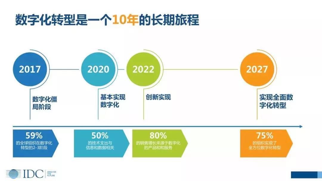 數字化轉型是一個10年左右長期旅程,2017年全球59%企業處在數字化轉型的第二、三階段,也是屬于一個爬坡階段,再往上走難度越來越大;到2020年基本實現數字化,50%的技術支出會與信息和數據相關;到2022年80%的銷售增長將來源于數字化的產品和服務,數字化必然在最后覆蓋的僅僅是企業的業務環節,而是整個企業。