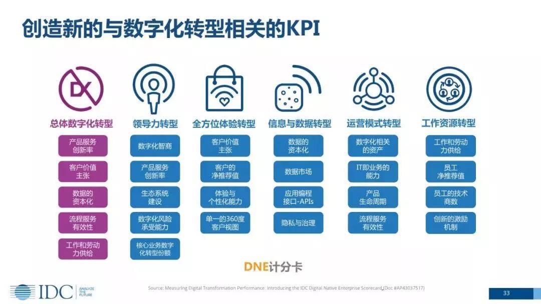 前面提到一個陳舊的KPI是數字化轉型的挑戰,IDC就五大方面提出了一些數字化轉型的指標:領導力轉型、全方位體驗轉型、信息與數字轉型、運營模式轉型、工作資源轉型。