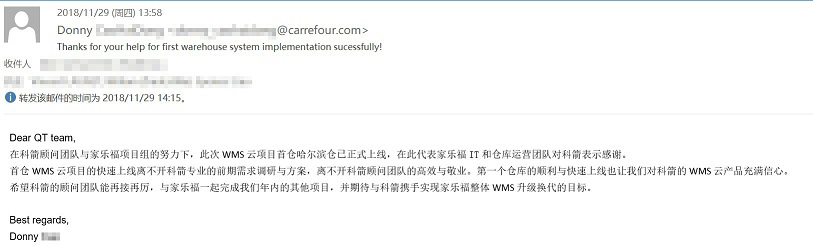 WMS云項目將覆蓋家樂福旗下全部區域的倉儲運營,期中包括六種倉庫類型,如干倉、衛星倉、生鮮倉、蔬果倉、冷凍倉、Dark Store,并且需要滿足家樂福在庫、越庫、直通、分配等不同模式與流程。目前科箭WMS云已在家樂福首個倉庫哈爾濱倉庫上線。科箭專業與敬業的顧問團隊獲得了來自己家樂福IT和倉庫運營團隊的認可。