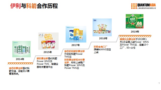 2015年10月,伊利酸奶事業部也與科箭簽約,實施Power WMS倉儲管理系統及Power TMS運輸管理系統,搭建全國物流管理平臺,整合酸奶事業部工廠及直營倉所有物流業務,并與已實施的液態奶事業部的Power物流系統進行整合,最終實現伊利股份全集團的物流供應鏈一體化管理。目前,已經上線工廠10個,直營倉10個,分倉15個。