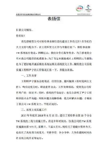 伊利奶粉事業部物流管理部給科箭的感謝信