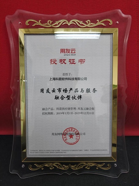 科箭供應(yīng)鏈管理—用友云融合版獲得用友云授予的授權(quán)證書,正式成為用友云市場產(chǎn)品與服務(wù)融合型伙伴。