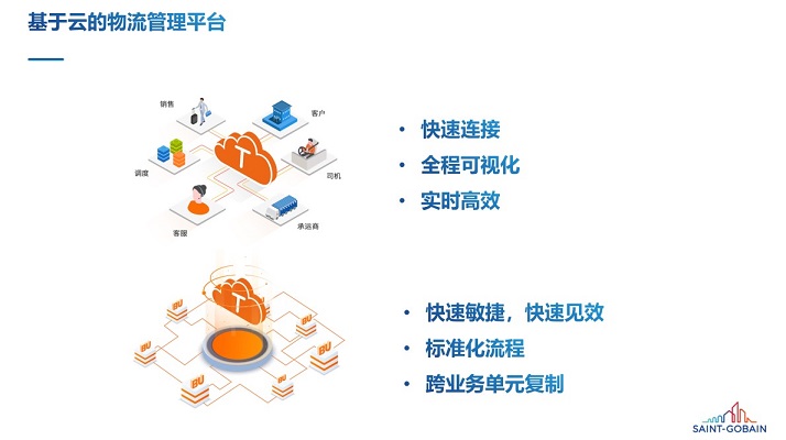 圣戈班在選擇物流平臺的時候,考慮了很多因素,最終選擇基于云的物流管理平臺,最主要的原因是基于物流的一個特點——參與的公司和人員特別多。基于云的解決方案能夠快速連接各個參與者,我們的客戶、供應商、物流供應商、司機,都能快速在平臺上實現連接,并做到全程可視化,實時高效。圣戈班是一個跨業務單元、跨BU、多公司的企業,云平臺能夠讓我們在一家公司形成的好做法、標準化的流程,迅速復制到其他工廠、公司,實現快速推廣,快速見效。