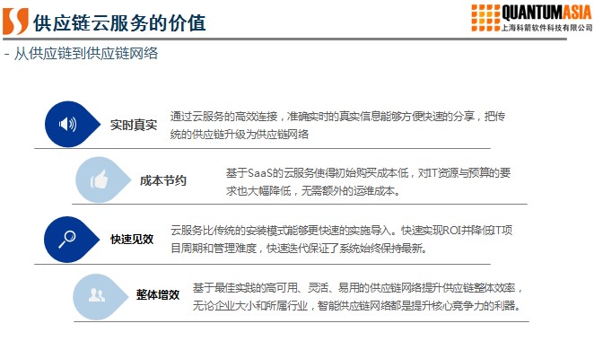 三、供應(yīng)鏈云服務(wù)的實(shí)現(xiàn)可以通過(guò):合作伙伴協(xié)作互聯(lián)、智能化、即插即用的擴(kuò)展和快速實(shí)施。