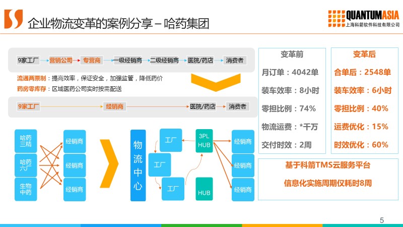 面對醫藥領域商業環境的一系列重要變革,哈藥對于其物流配送體系進行了大刀闊斧的重組和優化,由企業COO掛帥,在集團層面進行物流資源的統籌管理,并引入行業領先的優質物流合作伙伴,打造敏捷供應鏈和協同機制,并選擇科箭TMS云服務平臺提供有力的信息化支撐。該項目只花了8周實施時間即上線使用,在后續的各部門業務評估中各項KPI指標都有了顯著改善。