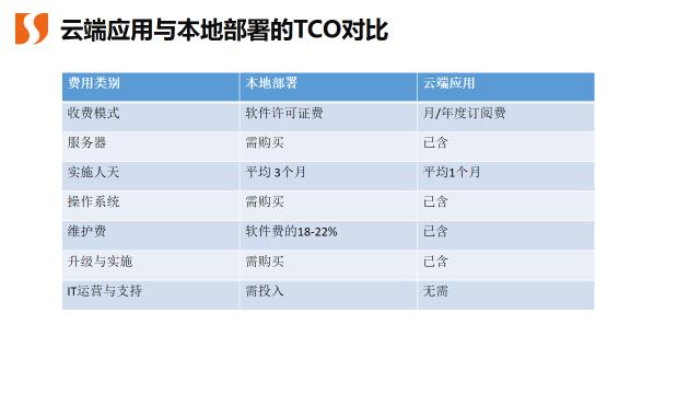 據(jù)IDC報(bào)告,未來五年,中國SaaS市場增速將是傳統(tǒng)軟件市場的10倍,而在轉(zhuǎn)型云端的考慮中,成本因素是大多數(shù)企業(yè)的重要出發(fā)點(diǎn)之一,比起傳統(tǒng)本地部署軟件動(dòng)轍上千萬的軟硬件成本投入,云技術(shù)帶來的SaaS解決方案無疑為客戶帶來更好的選擇。下表列舉了,兩種方式下企業(yè)所需要的總投入,SaaS與傳統(tǒng)軟件相比可以帶來快速導(dǎo)入、快速迭代、更低的TCO。