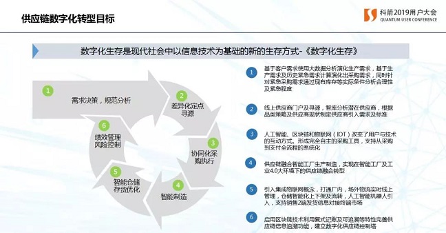 用一句話概括就是全面的數字化。數據連接以后,我們從需求的產生到尋源到采購到智能制造,到倉儲到風險控制全部都要想辦法實現數字化,當然在之前很多企業在某個點都可能已經上了某個系統,已經實現了一定的數字化。但是整個供應鏈沒有打通的話,這個點會成為一個瓶頸,會制約企業數字化的進程。