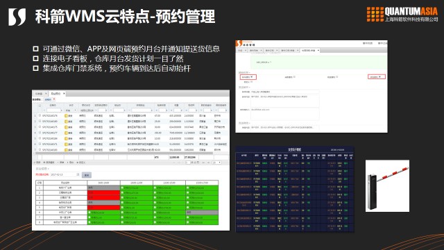 科箭的預約管理功能和WMS緊密結合在一起。我們通過微信、APP和網頁端進行預約月臺,并通知倉庫提送貨信息。通過連接一個電子看板,讓倉庫當天的提送貨信息一目了然。我們還有些客戶集成了倉庫和物流園區停車場的門禁系統,然后車輛的出入就可以和預約結合在一起,沒有預約進不了倉,車在園區多長時間你都可以控制。這既提升了廠區管理及倉庫效率,也為配送司機帶來方便。