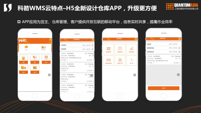 原來的WMS客戶基本都是使用PDA設備,然后在這個上面開發一個CS的程序,就能用APP進行掃描收貨、上架等工作了。我們現在是開發了WMS APP來做盤點、上架和揀貨的。另外我們還有管理人員APP,你的客戶和倉庫的管理人員以及銷售、客服部門的人員等。我們做的是基于H5的APP,可以跨平臺,支持蘋果手機和安卓手機。現在的人能用手機處理的事情就不用電腦。我們也是這樣的理念,我們會把所有的功能在APP上實現,管理人員用APP可以隨時關注業務數據。