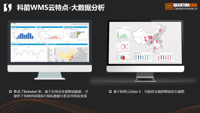 我們有了系統記錄的很多數據與流程,最終目的是要能把這些數據用起來。我們集成了國外先進的BI工具,用戶就可以通過這個工具來對自己的業務數據做更多分析,實現數據化。另外我們的云服務是跑在阿里云平臺,所以阿里那些的大數據展示工具也在我們的系統里面有集成,我們客戶可以通過此功能搭建自己的物流數據大屏。