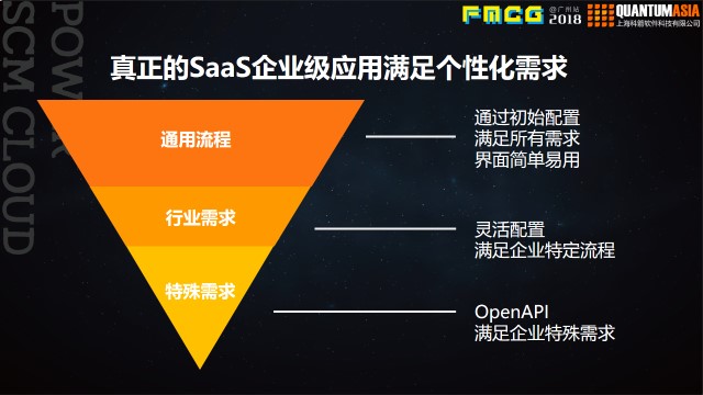 在座的有食品、醫(yī)藥、化妝品等不同的行業(yè),我相信你們每個(gè)行業(yè)都有自己的需求特征。作為IT來講最強(qiáng)調(diào)的一點(diǎn)是要滿足企業(yè)本身的業(yè)務(wù)特點(diǎn)和需求,所以我們?cè)品?wù)的方案也要考慮可配置性,每家企業(yè)都有自己的特點(diǎn),大家在選系統(tǒng)的時(shí)候一定會(huì)提出來我這個(gè)特殊的功能你能否幫我實(shí)現(xiàn),我要去定制。我想強(qiáng)調(diào)的是科箭供應(yīng)鏈云平臺(tái)在設(shè)計(jì)之初就考慮到這一問題,我們基于微服務(wù)的輕PaaS架構(gòu),使云端交付的SaaS產(chǎn)品可以通過配置來滿足你的行業(yè)需求,也可通過Open API實(shí)在定制化服務(wù)的對(duì)接來滿足您最后一公里的企業(yè)個(gè)性化需求。